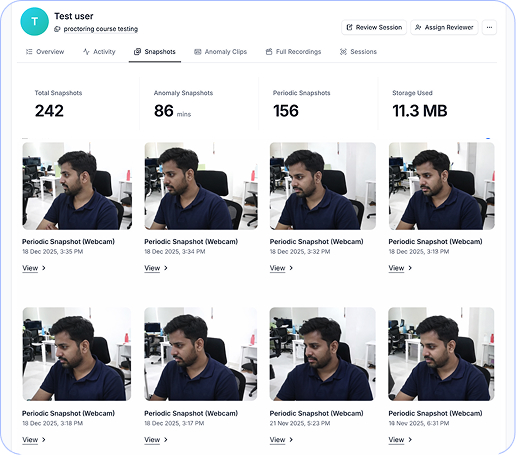 -Secure storage of proctoring snapshots, recordings, and anomaly reports ensures full compliance.